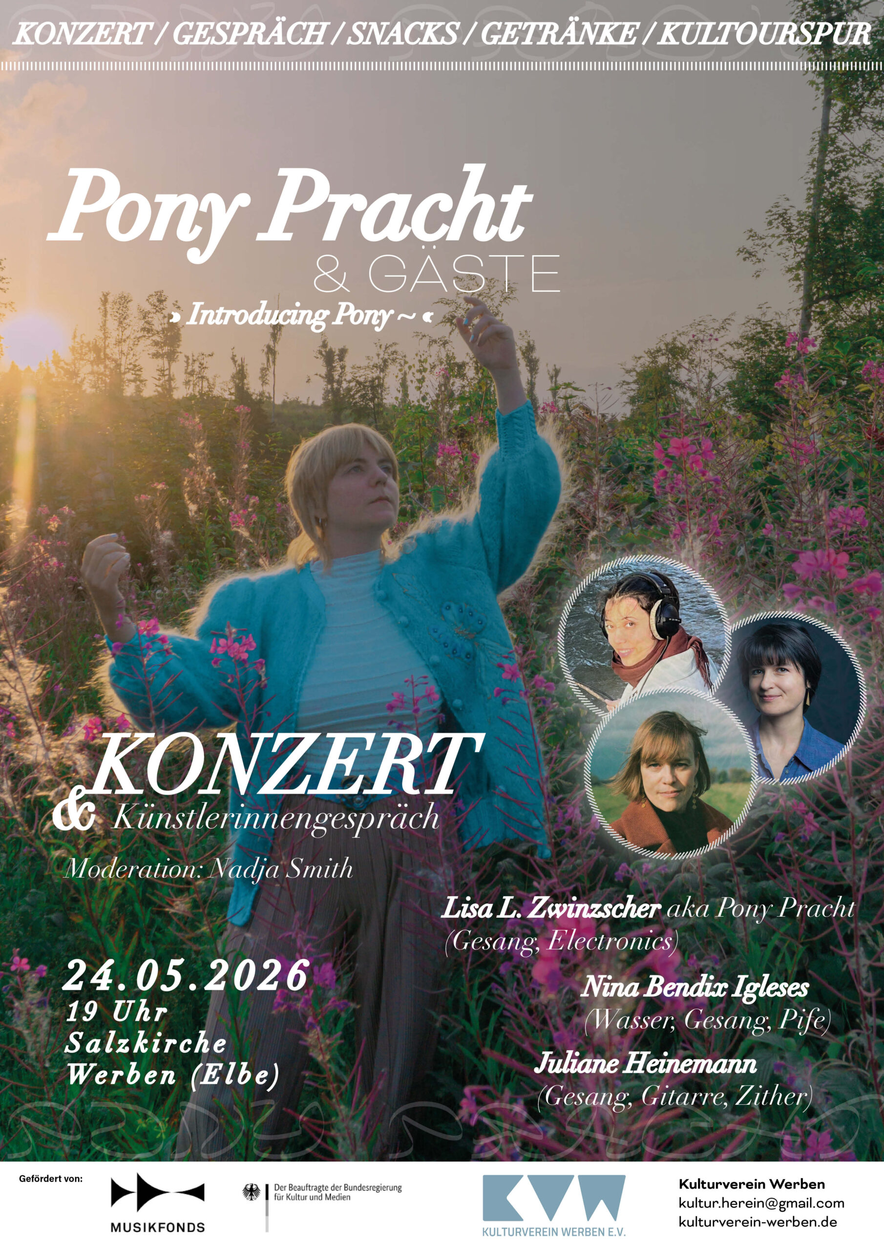 Pony Pracht ist das vielschichtige Soloprojekt der in Leipzig lebenden Sängerin und Medienkünstlerin Lisa L. Zwinzscher. Mit ihren Wurzeln im Jazzgesang verwandelt sie ihre Stimme – überlagert, vervielfacht und umgestaltet – in ein komplexes, dynamisches Ökosystem, das atmet, pulsiert und sich stets weiterentwickelt. Mit „Pony~” fügt sie ihrem wachsenden Biotop ein neues Element hinzu: ihre eigene KI-Stimme – ein digitales Gegenüber, mit dem sie und ihre Mitmusikerinnen in einen musikalischen Dialog treten. Für das Konzert in Werben wurden die in der Region ansässige Sängerin und Filmkomponistin Juliane Heinemann sowie die Weimarer Klangkünstlerin Nina Bendix Igleses eingeladen.