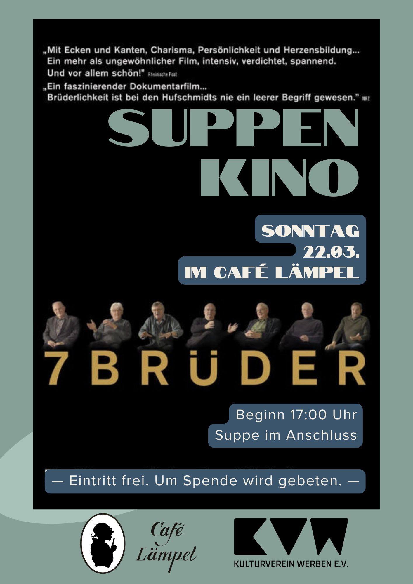 17:00 Uhr Dokumentarfilm: DIE SIEBEN BRÜDER, in Anwesenheit des Regisseurs Sebastian Winkels und einem der Protagonisten Jochen Hufschmidt. Suppe gibt es im Anschluss.